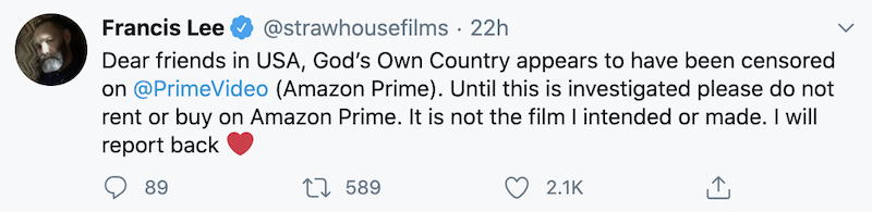 “Dear friends in USA,” wrote the director. “God’s Own Country appears to have been censored on @PrimeVideo (Amazon Prime). Until this is investigated please do not rent or buy on Amazon Prime. It is not the film I intended or made. I will report back.”