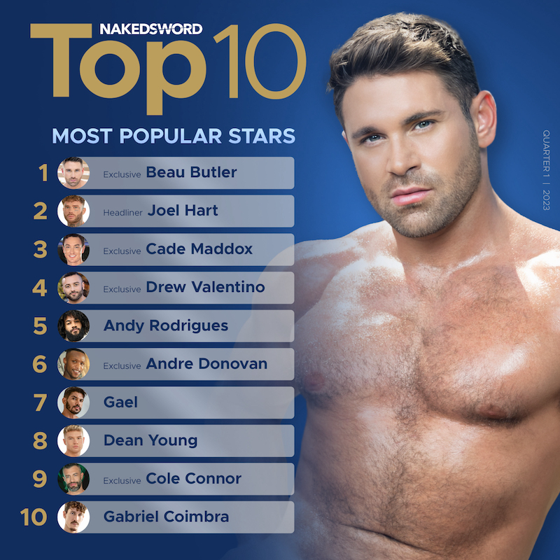 You know how much we love seeing Beau Butler top! We can’t get enough of this Falcon | NakedSword Exclusive when he’s topping some hot twink hole and we definitely can’t get enough of him when he’s topping the list of NakedSword’s most popular performers of the first quarter of 2023!