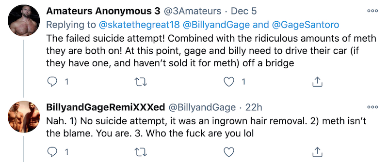 Actually, the only thing their account has tweeted about since Friday is that suicide attempt from June. Yes, that suicide attempt. The one where Gage tweeted a photo of Billy in the hospital, said that Billy attempted suicide the previous night, and pleaded with everyone to stop bullying Billy for saying that people should shoot Black protesters.