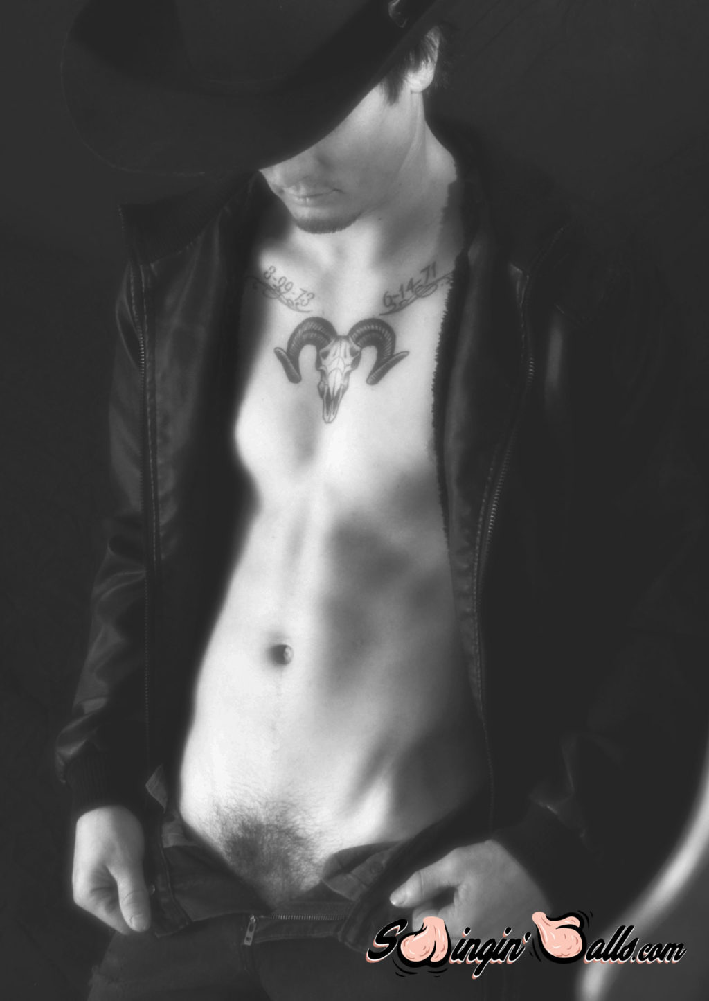 Once he’s inside and on the bed, he keeps the hat on to fuel our fantasies. His nuts are hairy and low-hanging, his ass crack rosy and covered with soft downy hair. The tattoo of a ram’s horned skull is blazoned across his chest.