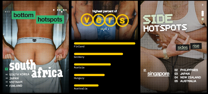 Apparently, South Africa is bottom boy central. If you’re into flip fucking, Finland has the most versatile men. Finally, Singapore is all about the sides. But, no strict top stats this year?
