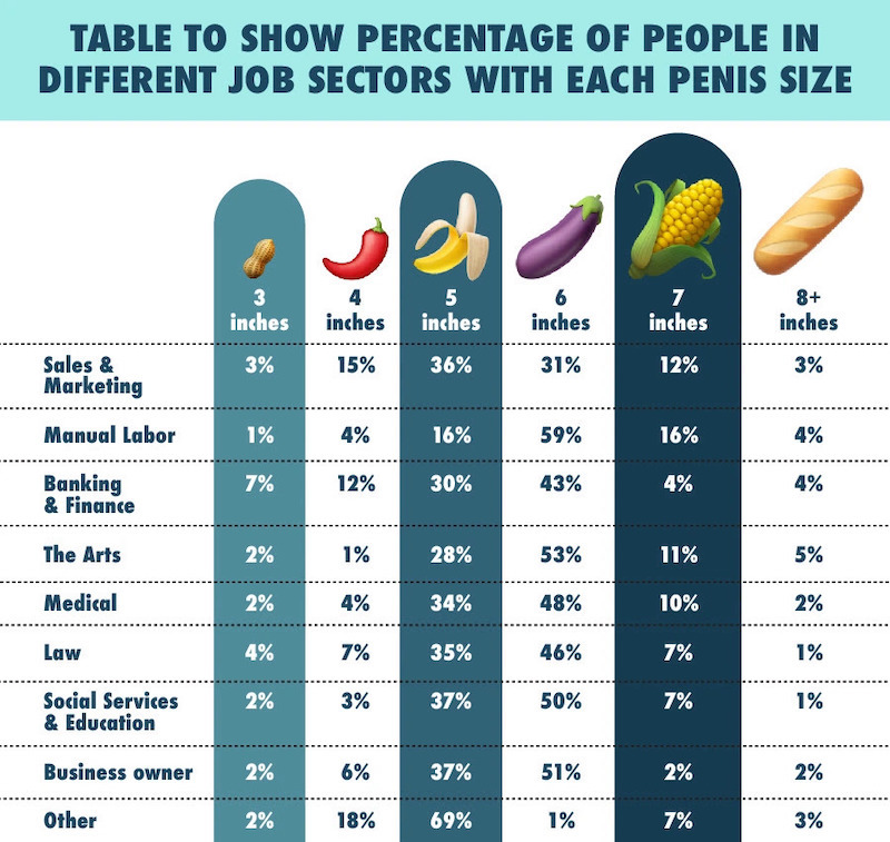 I think you don’t know how to conduct a basic survey. There will always be fewer 3 inchers and 8+ inchers in any profession because they’re a smaller portion of the population. You have to ask “Of the 8 inchers, what percentage are in medicine, law, business or arts, manual labor or social services.”