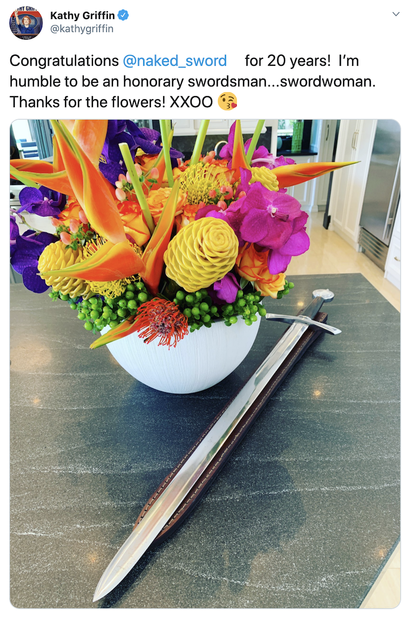 “Congratulations @naked_sword for 20 years! I’m humble to be an honorary swordsman…swordwoman,” Griffin wrote. “Thanks for the flowers! XXOO…”