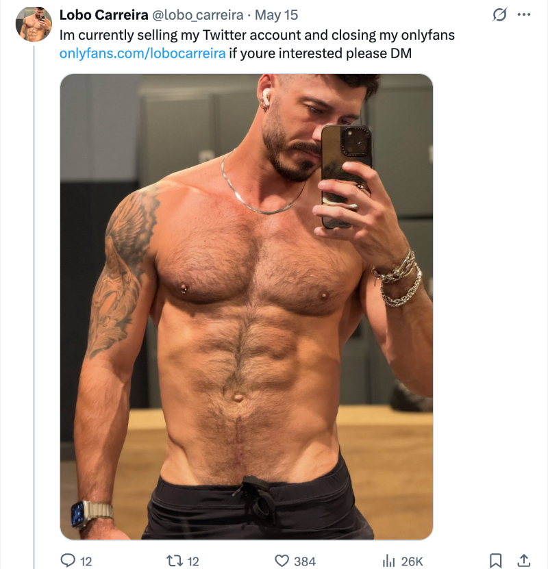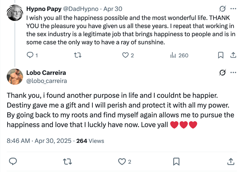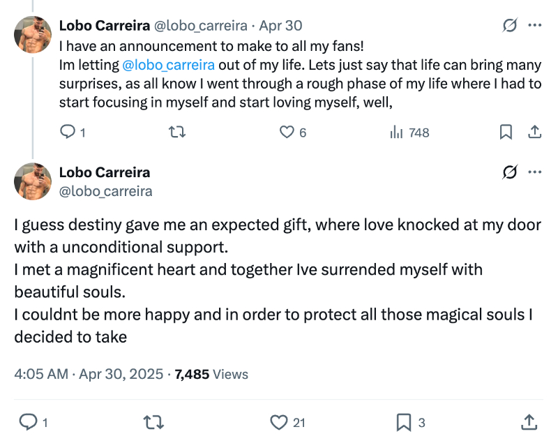 Lobo continued, “Love knocked at my door” and he decided to move to another unspecified career path. A video expressed his desire to have and protect a family in the future. Further, the porn star will shut down his fan sites and switch his Instagram to private. All his collaborations are available on his OnlyFans (no PPV) for the next month, and then they will be gone forever. Apparently, he’s also selling his Twitter account.