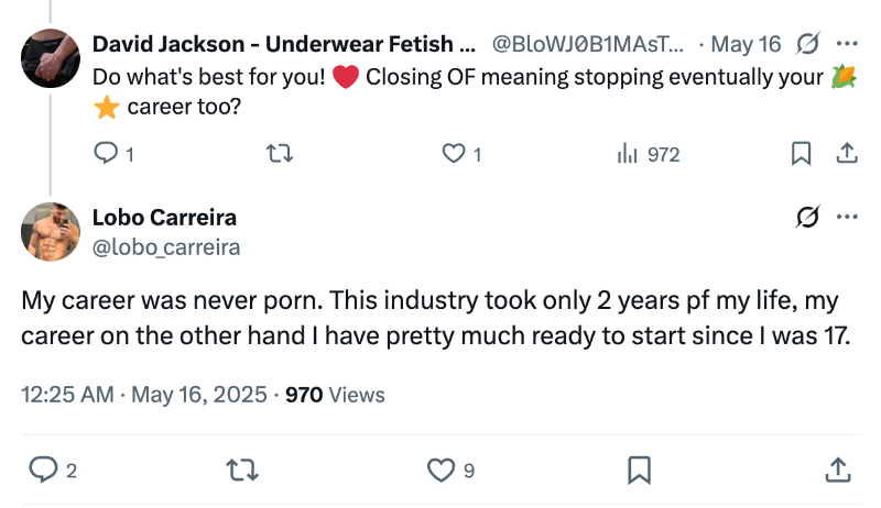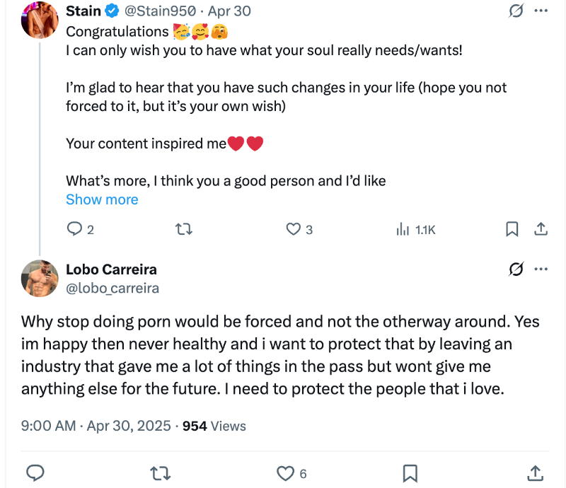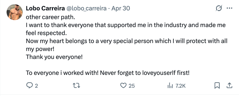 Lobo thanked his supporters and collaborators. He responded to a fan, explaining that porn was never his long-term career. He only worked in the industry for two years, but he’s brewing other plans.