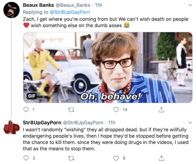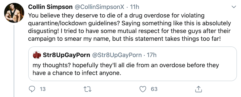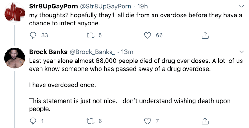 I agree with str8upgayporn’s tweet. Whoever purposely violates stay-at-home orders in this global pandemic deserves the worst. Besides, they didn’t wish them tragedy. They wished them to OD which is what happens sooner or later when you do drugs. If they aren’t doing drugs, they have nothing to worry about.
