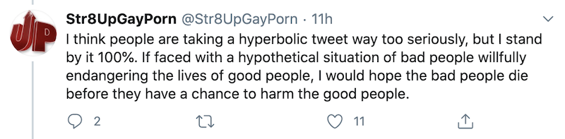 Let Str8upgayporn spin it anyway they want. They should be soundly condemned by everyone for tweeting such a hateful comment.