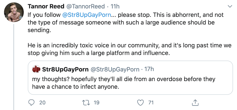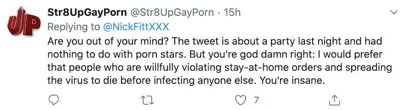 Glad to see that the commenters on this post actually have a clue and understand this is fake outrage by these porn “stars”. Can’t believe they are focusing on someone’s random tweet and how that “makes our industry look” and not the video of the dozens of gays doing drugs at a sex party in the epicenter of the virus, NYC, during quarantine. That story is everywhere and is what makes us look bad, not Str8UpGayPorn.