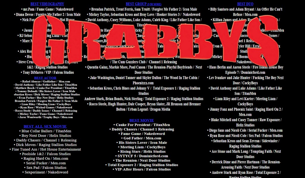 Like a once-in-a-lifetime confluence of astronomical events, the International Mr. Leather Expo is happening in Chicago this weekend AT THE SAME TIME as the infamous Grabby Awards. The Sword will be covering the weekend live-blog style, in association with Fleshbot. After the jump, a refresher (in case you missed them the first time) on this year’s Grabby nominees.