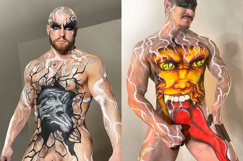 Everyone’s favorite OnlyFans/JustForFans couple is getting into the Halloween spirit a little early. In new images from celebrity photographer and RuPaul’s Drag Race personality Mike Ruiz, real-life partners Rick and Griff Twombley-King can be seen embracing the Halloween season by getting completely naked and dressing up with the help of some elaborate (and slightly terrifying) body art.