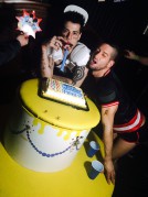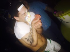 By the end of the night, the room was a mess after the boys got into a drunken cake fight and in the photos you can see that more cake went onto Mickey’s face and an unidentified cock than went into his mouth. Also, more cock went into his mouth than cake.