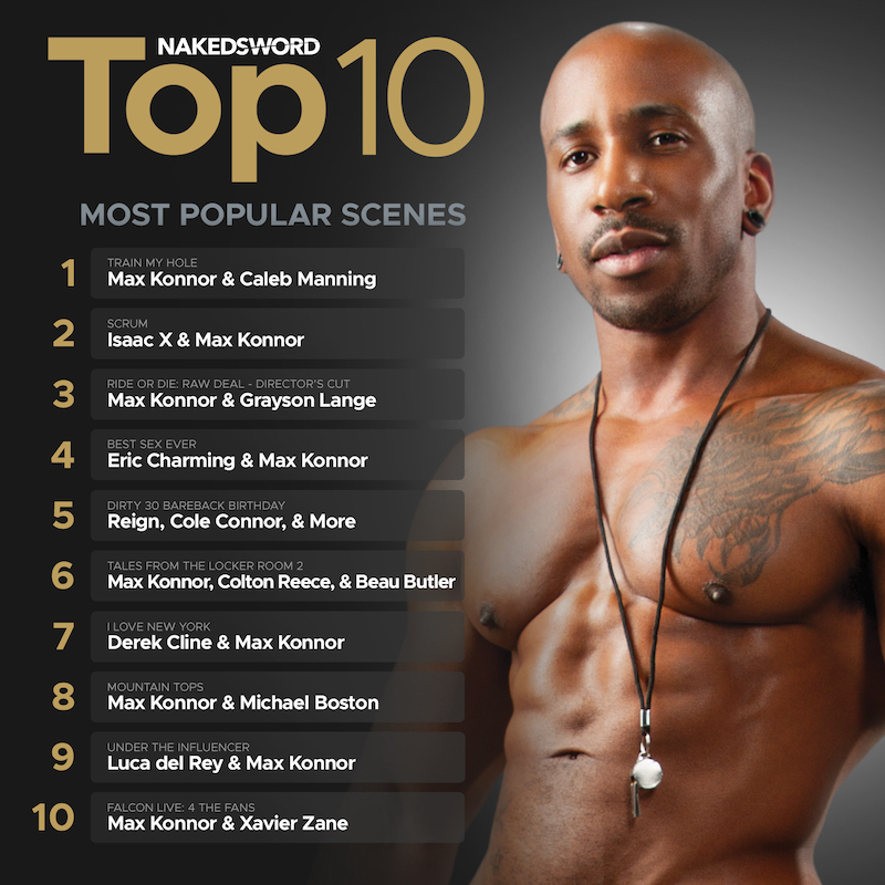 Compiled from video views on the NakedSword platform, this list is made up of fan favorite scenes from popular studios like Falcon, Raging, and NakedSword Originals. They see Max teaming up with or topping A-list stars like Falcon | NakedSword Exclusives Beau Butler, Colton Reece, Cole Connor, and Reign, along with Isaac X, Michael Boston, and Derek Cline.