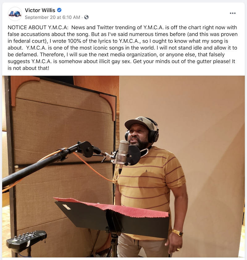 “But as I’ve said numerous times before (and this was proven in federal court), I wrote 100% of the lyrics to Y.M.C.A., so I ought to know what my song is about. Y.M.C.A. is one of the most iconic songs in the world,” Willis wrote. “I will not stand idle and allow it to be defamed. Therefore, I will sue the next media organization, or anyone else, that falsely suggests Y.M.C.A. is somehow about illicit gay sex.”